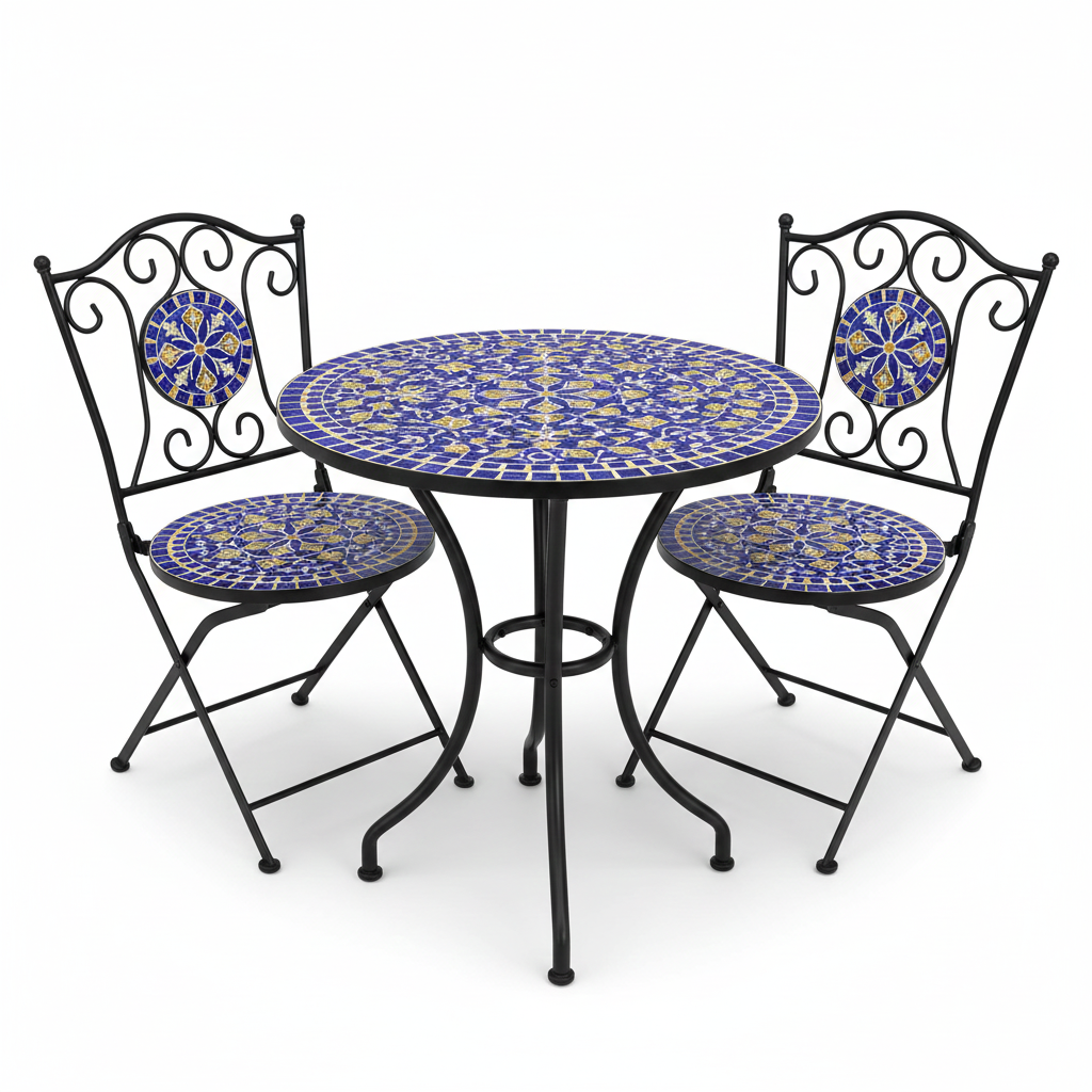 Perfect for morning tea. This set includes a table and two chairs featuring a hand-set ceramic tile mosaic in shades of royal blue and gold.